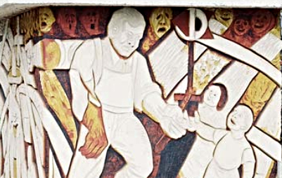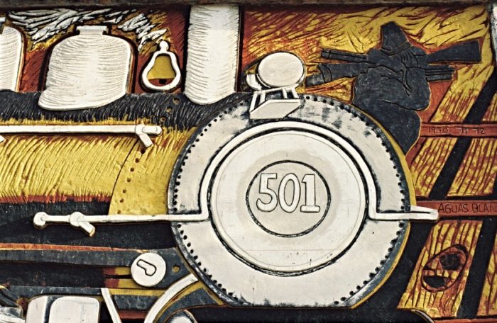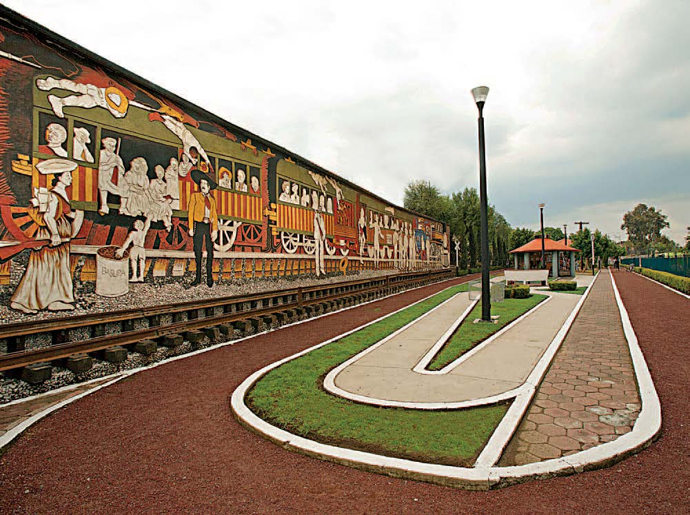 The mural El viaje del siglo XX (“20th century journey”), the work of Ariosto Otero, deserves special attention. It depicts the popular Máquina 501 with characters that evoke the Mexican Revolution, the traditional organ player and various celebrities from the Mexican theatre, cinema and music. The water cistern for the irrigation system in this plaza served as the canvas for this muralist, originally from Magdalena Contreras, in his work Cuando murió el tren (“When the train died”).